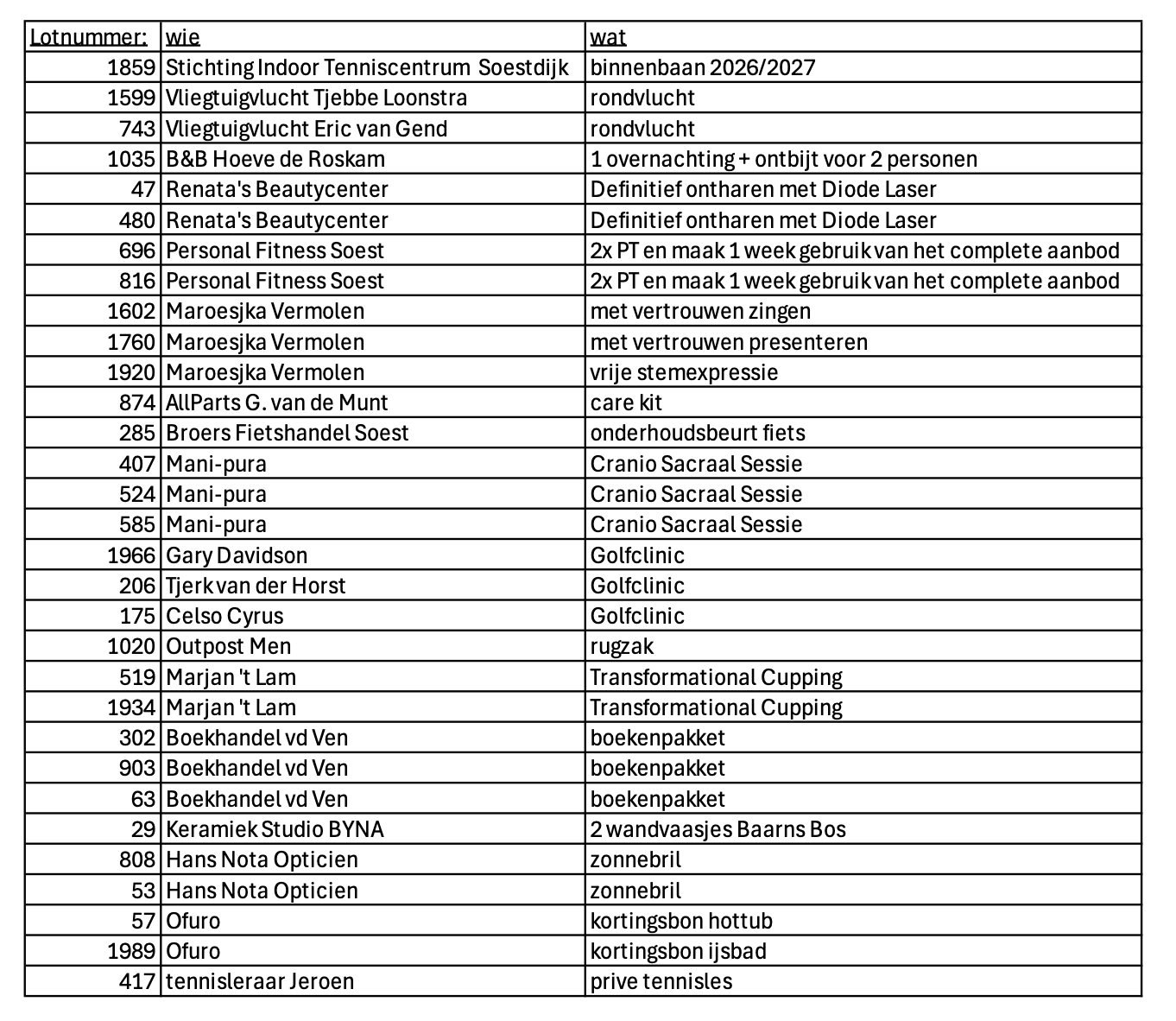 En dan natuurlijk de winnende lotnummers loterij. Die vind je onderaan dit bericht. Gewonnen? Dan kun jij je prijs ophalen op zaterdag 10 januari tussen 10:00 en 12:00 uur in de bestuurskamer. Uiteraard op vertoon van het winnende lot.
